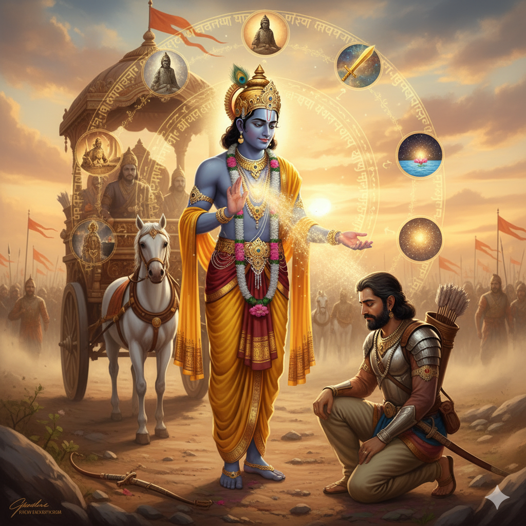 In the Sankhya Yoga,Bhagavan SriKrishna presents these truths directly.For those unable to grasp them in abstraction,he reiterates the same wisdom through karma siddhanta — the doctrine of action and consequence.