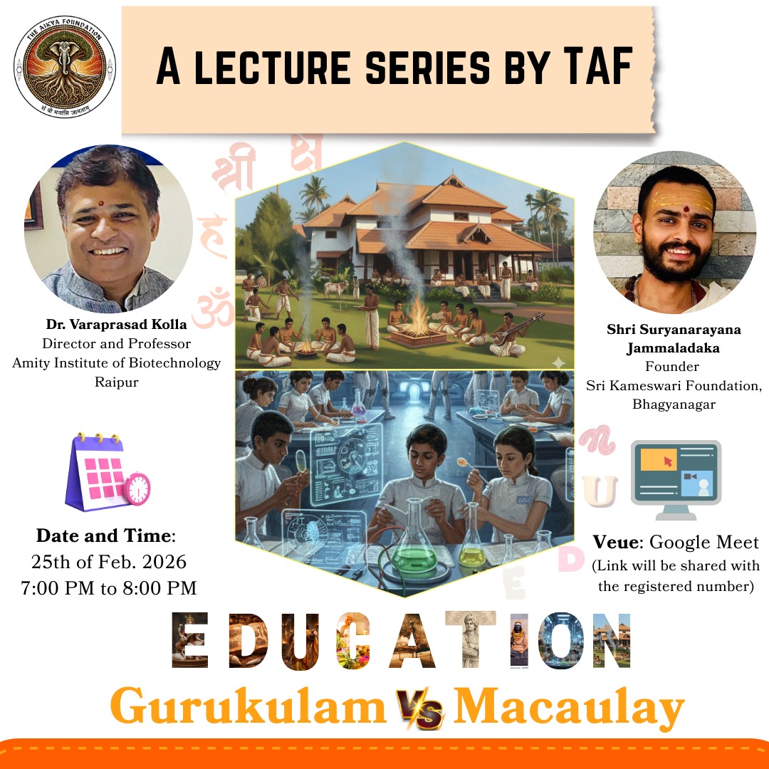 Dr.Jammalamadaka Suryanarayana garu was invited by The Aikya Foundation (TAF) to deliver a lecture on the Gurukula education system and on the need to decolonise ourselves from Macaulay’s ideology.
